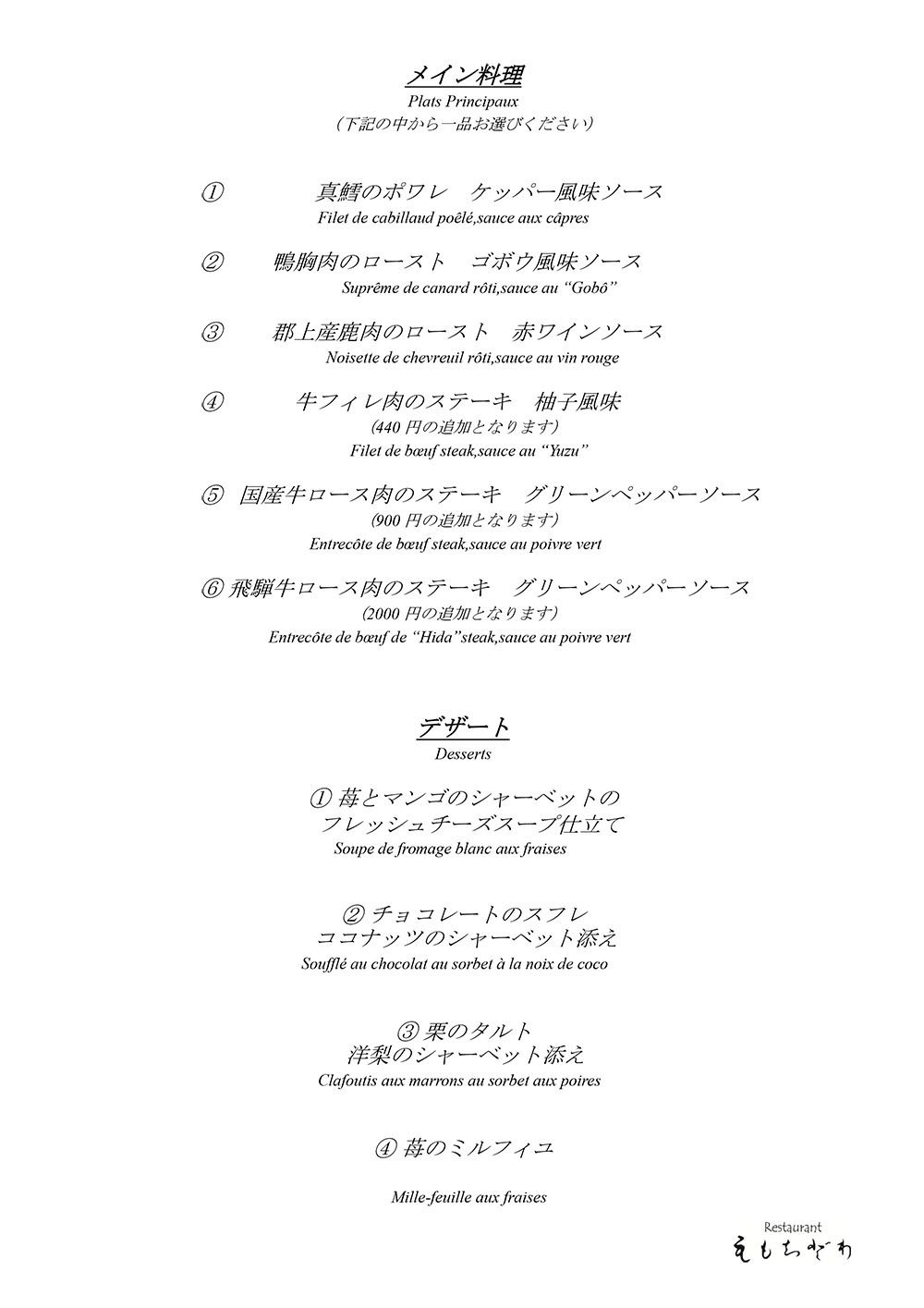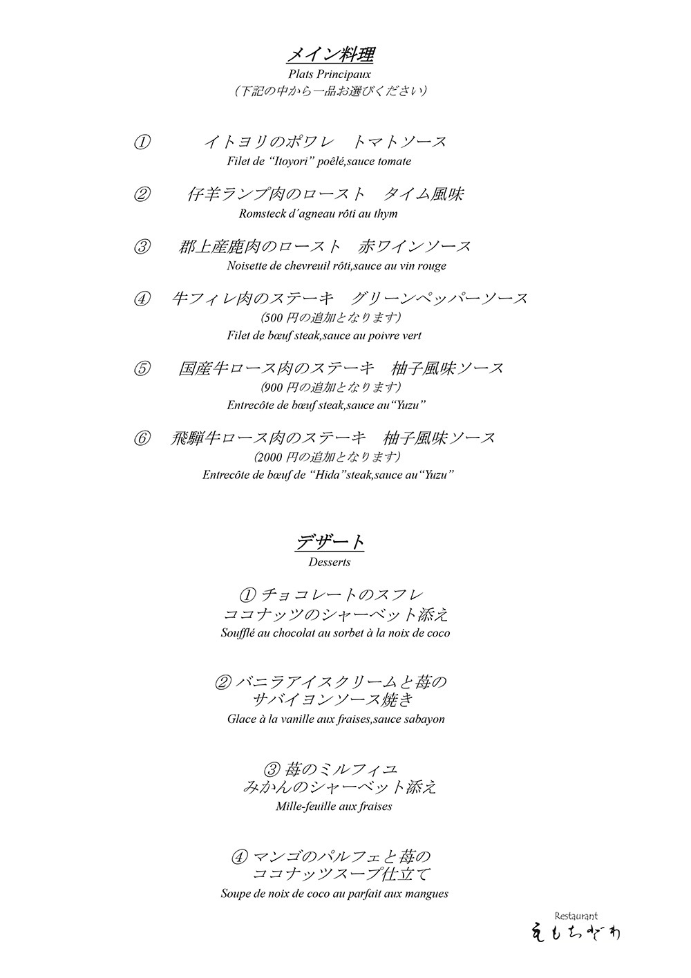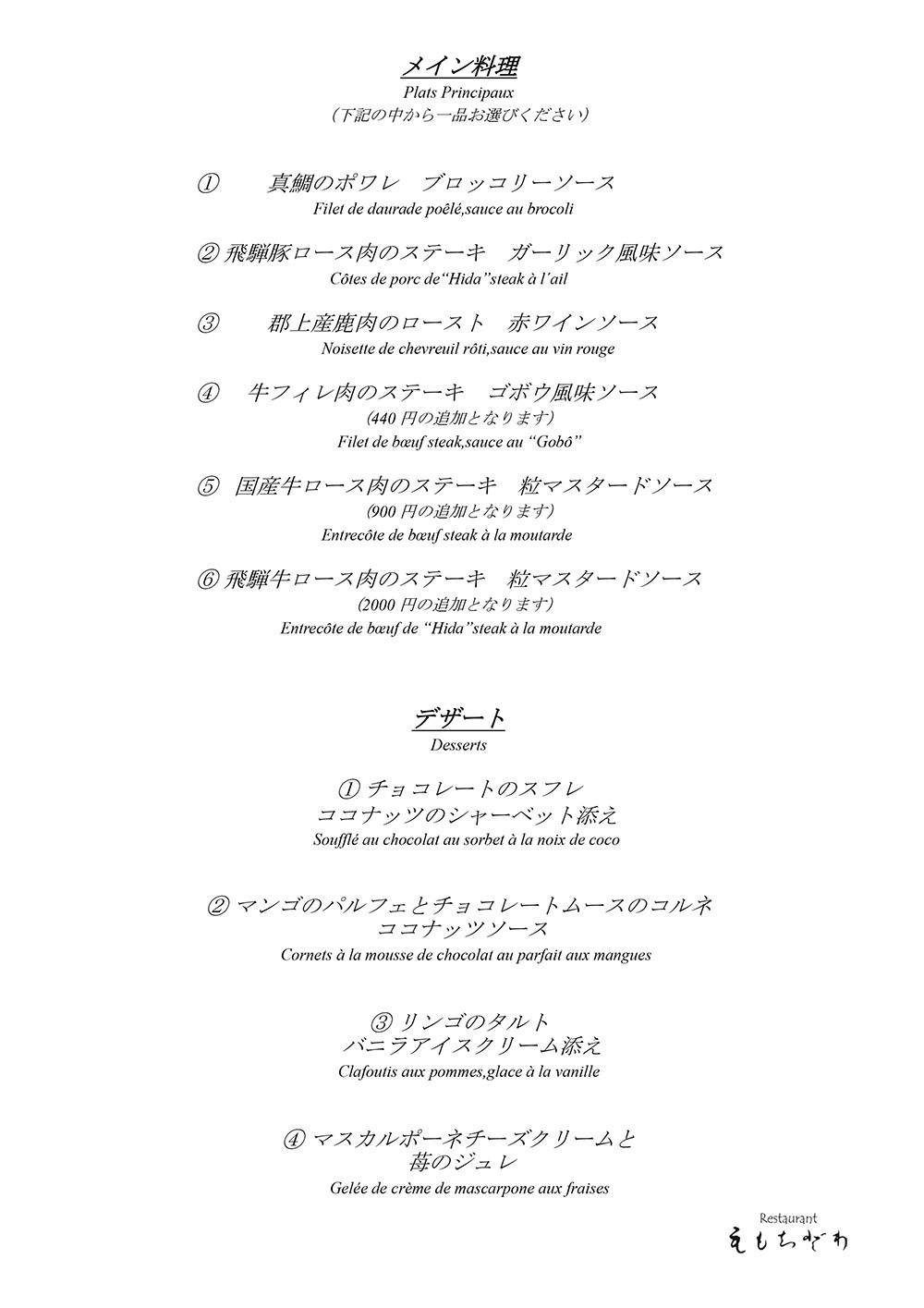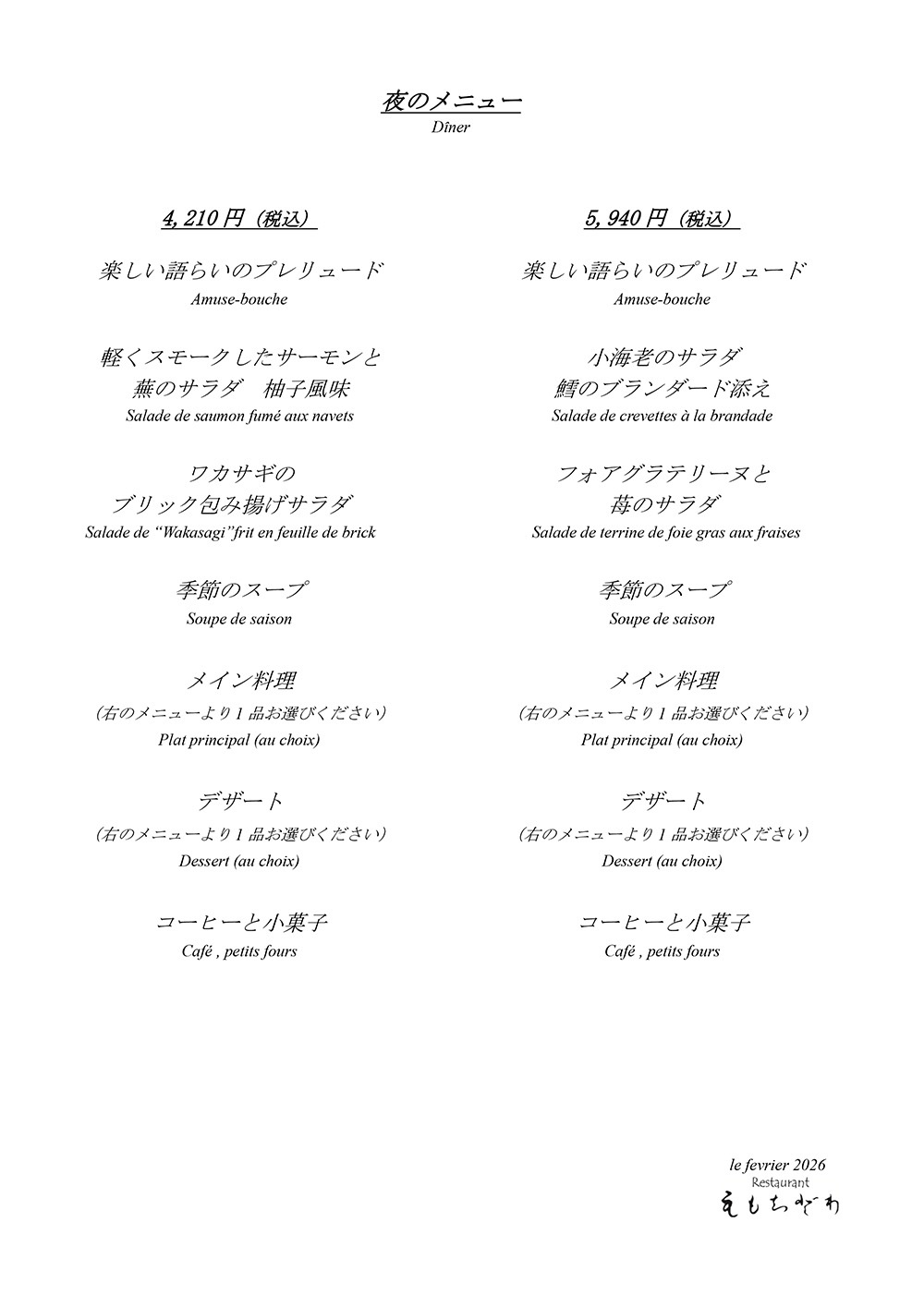- ・ただし火曜日が定休日のため、水曜日ディナーは月曜日までにご予約下さい。
